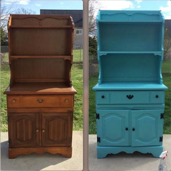 This LOVELY Tiffany blue hutch was my first ever attempt at painting furniture. There were no YouTube "how-to" videos involved...this baby wasn't sanded or primed, was painted with semi-gloss wall paint and a $2 chip brush. I didn't even know that sealing furniture was a thing, let alone that I should be doing it! She's riddled with brush strokes and I'm sure paintbrush bristles dried right into the surface, but the paint stuck and I truly loved her. She was used as cookbook and crockpot storage for years after in my home :-)